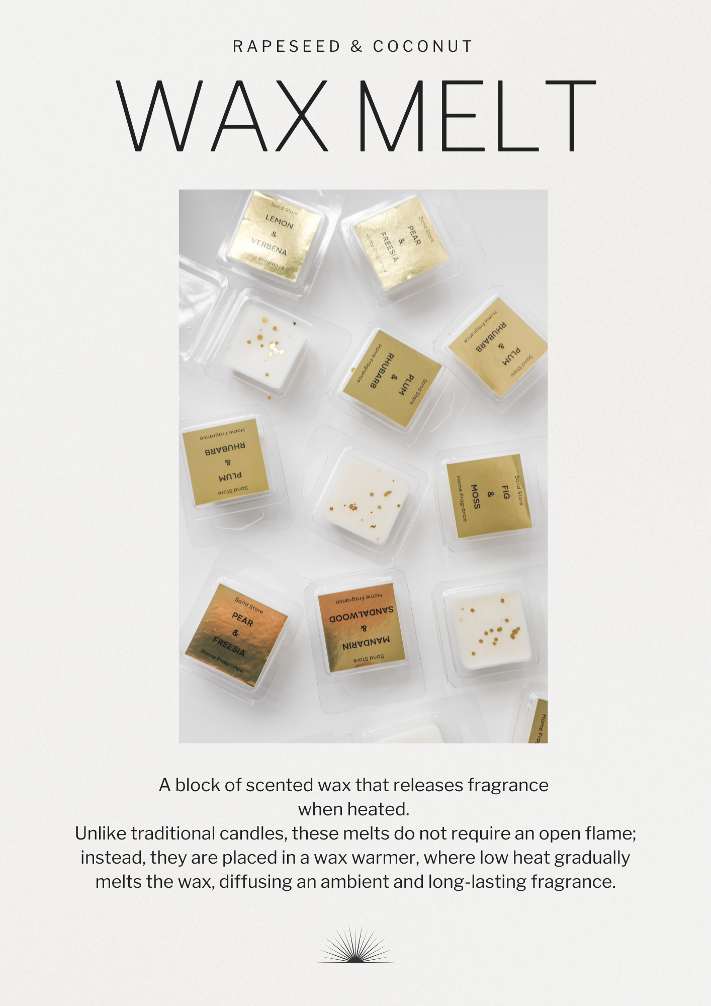 Never leave a burning candle unattended and keep lit candles out of the reach of children and pets Melt warmers and the scented wax melts should not be burned for more than two hours at a time Do not touch the melt warmer whilst in use as it will be hot, allow to cool before handling, as the soy wax melt cools down it will solidify again and can be remelted until the fragrance has gone.